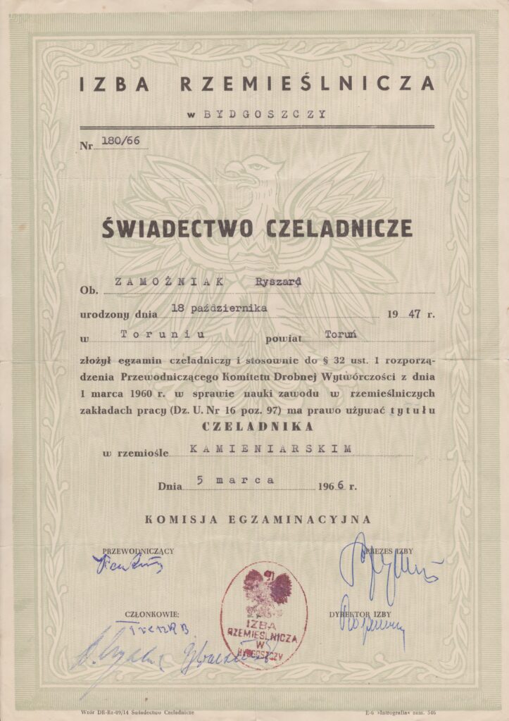 Swoją przygodę kamieniarską rozpocząłem jako młody chłopak ucząc się obróbki kamienia u najlepszego na tamte czasy kamieniarza w Toruniu. Zdobyłem dyplom czeladnika, a następnie mistrza.